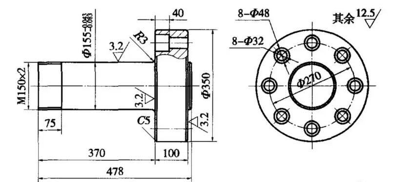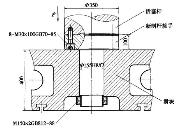 而其維修與修理過程詳細如下:拆除液壓機設備上的主缸活塞,將主缸活塞桿斷口處車平,并加工出與桿接手配合的止口,再加工均布的M30螺紋孔。按圖2制作桿接手。用M30高強內六角螺栓將桿接手與活塞桿緊固在一體。將主缸和上橫梁垂直吊起,套入四個立柱之上,把上下立柱鎖緊螺母擰在立柱上,下鎖緊螺母應充分緊固,上鎖緊螺母則應稍留間隙備調整精度時用。充液桶安裝、加油,使主缸全行程動作數(shù)次,將油缸和管路內空氣排除干凈。主缸活塞下行至與滑塊上平面相接觸后,用雙螺母固定(圖3)?;瑝K與主缸活塞緊固聯(lián)結后,按規(guī)定精度調整,將立柱鎖緊螺母盡量緊固。進行負荷試車。在滑塊側面醒目位置上設警示標牌,標“不得超過最大偏心距使用,嚴禁超過滑塊的最大行程使用”。當修復后液壓機設備的開口高度由1200mm減小為1100mm,但仍可滿足工藝裝備要求。